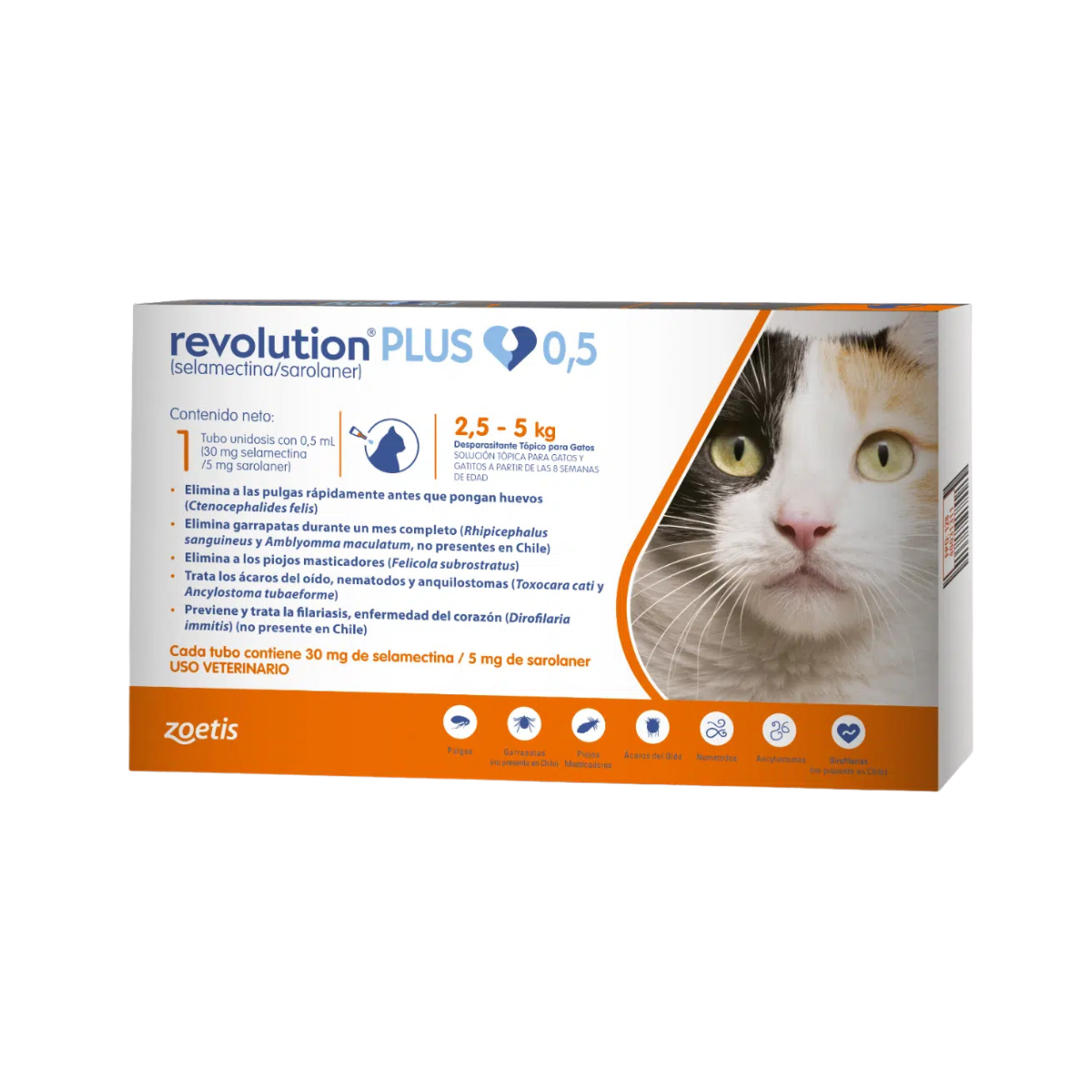 Revolution Plus es un producto para gatos y gatitos a partir de 8 semanas de edad, formulado para ayudar en el control de parásitos tanto internos como externos. Este tratamiento está diseñado para el control y prevención de pulgas, garrapatas, piojos masticadores, ácaros del oído, y para el apoyo en el control de filariasis causada por Dirofilaria immitis y de infecciones por nematodos intestinales.